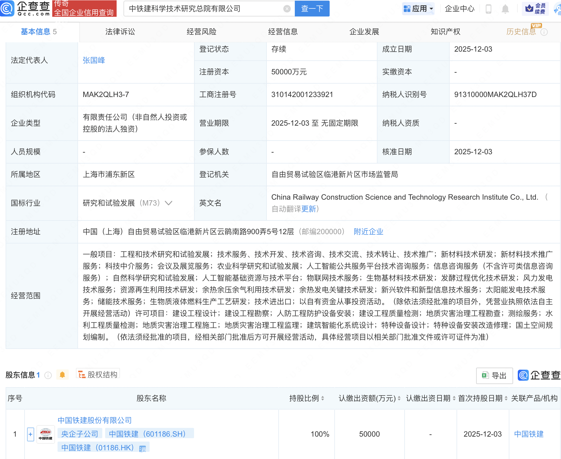 近日杭州配资平台,中铁建科学技术研究总院有限公司成立,注册资本5亿元,经营范围包含:人工智能基础资源与技术平台;物联网技术服务;生物基材料技术研发;发酵过程优化技术研发等。企查查股权穿透显示,该公司由中国铁建(601186)全资持股。