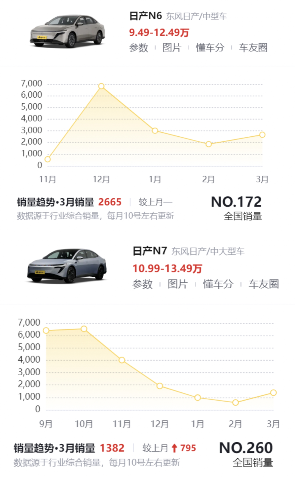 以东风日产N7为例,这款车自2025年4月上市后销量一直攀升。根据懂车帝数据显示,其当年8月实现月销量突破1万辆,不过此后销量便开始下滑,今年3月的销量仅为1382辆;2025年12月上市的东风日产N6,上市当月交付了近7000辆的成绩单,但此后也逐渐走低,今年3月销量为2665辆。