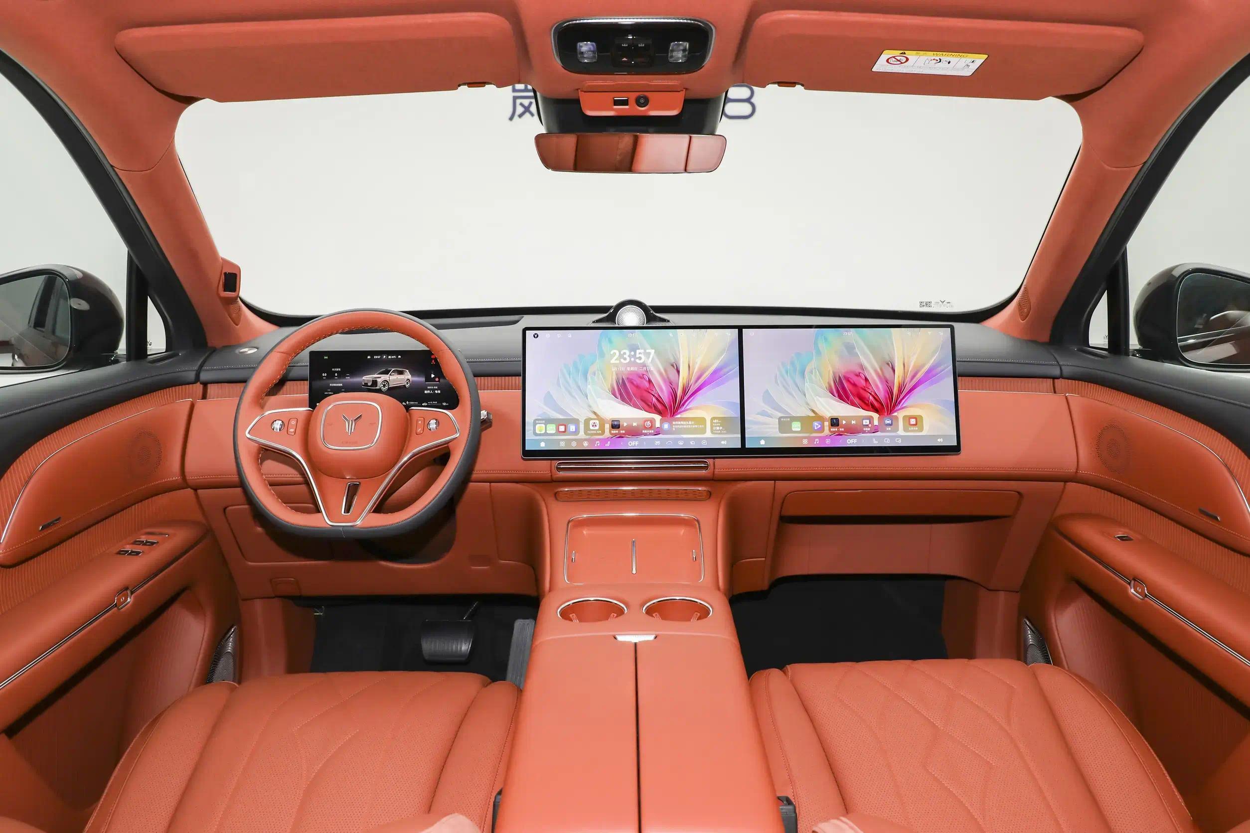 内饰方面也是如今流行的设计语言,提供有三幅式多功能方向盘、全液晶仪表盘、中控/副驾双联屏以及电子怀档,主打科技感方面的表现,操作台部分设计有无线充电面板以及杯架,而且运行了鸿蒙座舱。
