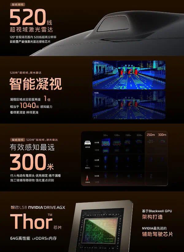 智己LS8还拥有较为出色的智能化能力,全系标配英伟达Thor芯片(700TOPS算力)、520线超视域激光雷达,搭载Momenta IM AD ZETA大模型,支持高速/城市领航辅助。