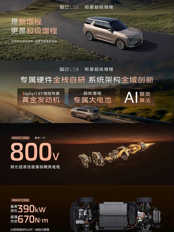 公开信息显示,智己LS8车身长宽高为5085mm、2000mm、1807mm,轴距3060mm,提供五座与六座布局,动力系统搭载1.5T“恒星”超级增程系统,四驱版百公里加速4秒级,CLTC纯电续航最高430公里,综合续航达1605公里;支持800V超快充,30%-80%充电仅需12分钟。